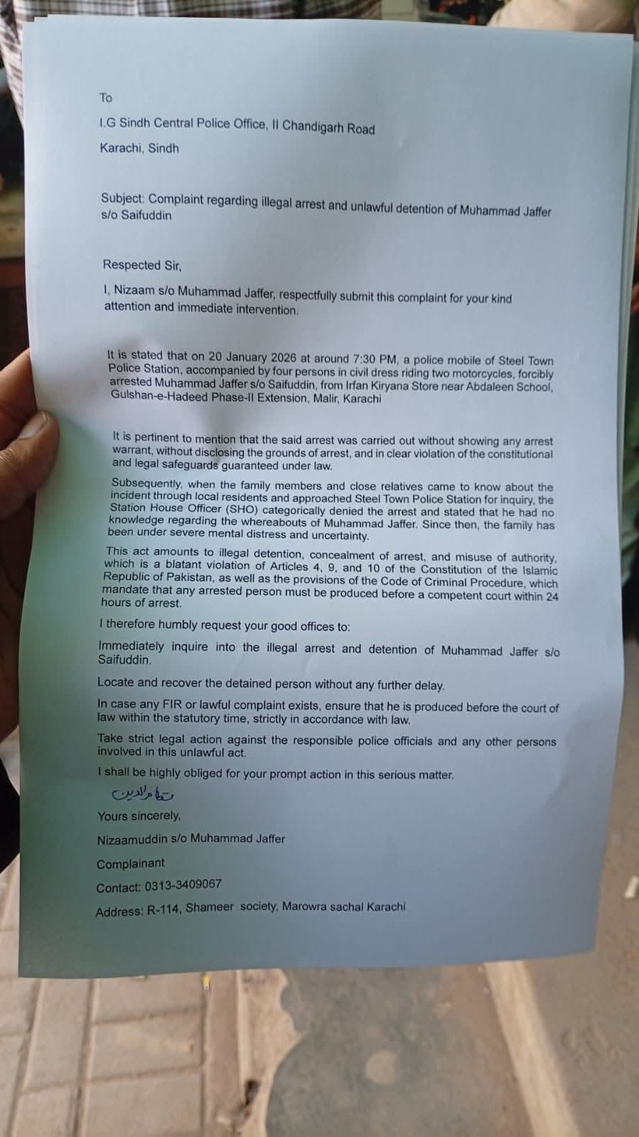 تاہم، زمینی حقائق اور اہلِ خانہ کے بیانات پولیس کے مؤقف سے مختلف ہیں۔ لواحقین کا کہنا ہے کہ محمد جعفر کو دو روز قبل گلشنِ حدید فیز 2 سے اسٹیل ٹاؤن پولیس نے حراست میں لیا تھا، جس کے بعد اب اسے مبینہ طور پر جعلی مقابلے میں ہلاک ظاہر کیا گیا ہے۔