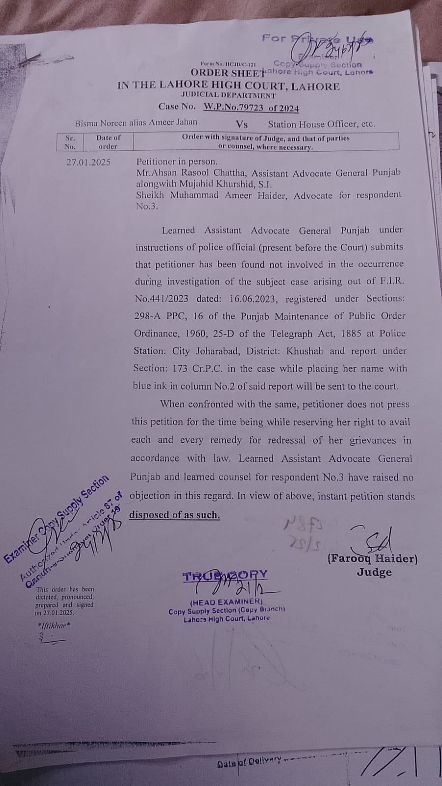 لاہور ہائیکورٹ نے اپنے فیصلے میں واضح کیا کہ بسمہ نورین کے خلاف درج کیے گئے دو مقدمات بدنیتی پر مبنی اور جھوٹے تھے، جس کے بعد عدالت نے انہیں ان الزامات سے بری کر دیا۔ جبکہ قتل کی دھمکیوں سے متعلق ایک مقدمے پر عدالت نے خوشاب ڈسٹرکٹ کورٹ کو 249-A کے تحت درخواست دائر کرنے کی ہدایت جاری کی، جس سے یہ بھی ثابت ہوا کہ تیسرا مقدمہ بھی اسی جھوٹے مقدمات کی کڑی تھا۔