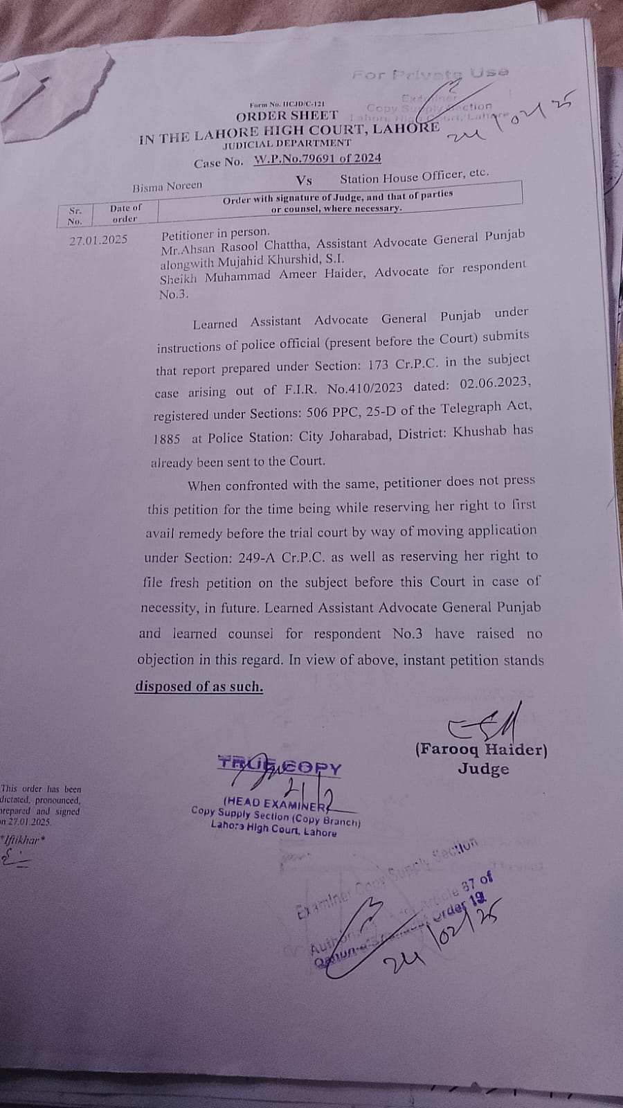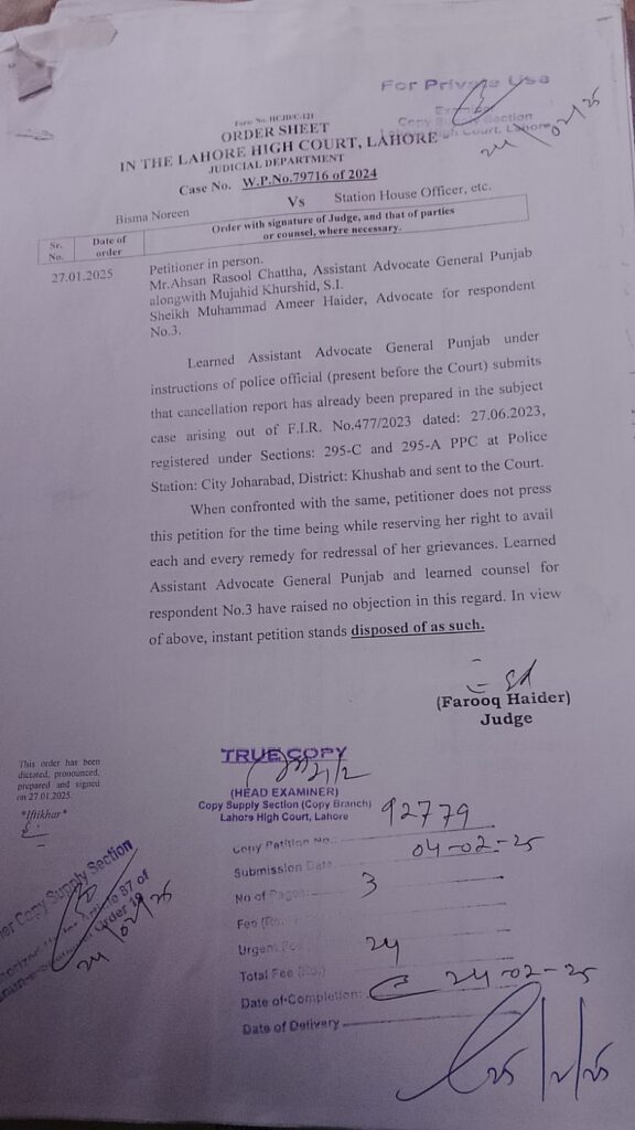 خوشاب: بسمہ نورین کے خلاف درج جھوٹے مقدمات لاہور ہائیکورٹ سے خارج، فالس کیس ثابت
